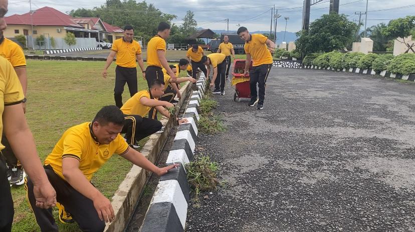 Dalam rangka mendukung program Gerakan Indonesia Asri serta menciptakan lingkungan kerja yang bersih, rapi, dan nyaman, personel Polres Bengkulu Tengah melaksanakan kegiatan kurve atau kerja bakti di seputaran Markas Komando (Mako) Polres Bengkulu Tengah, Jumat (13/03/2026).